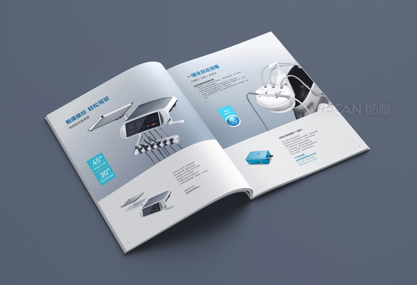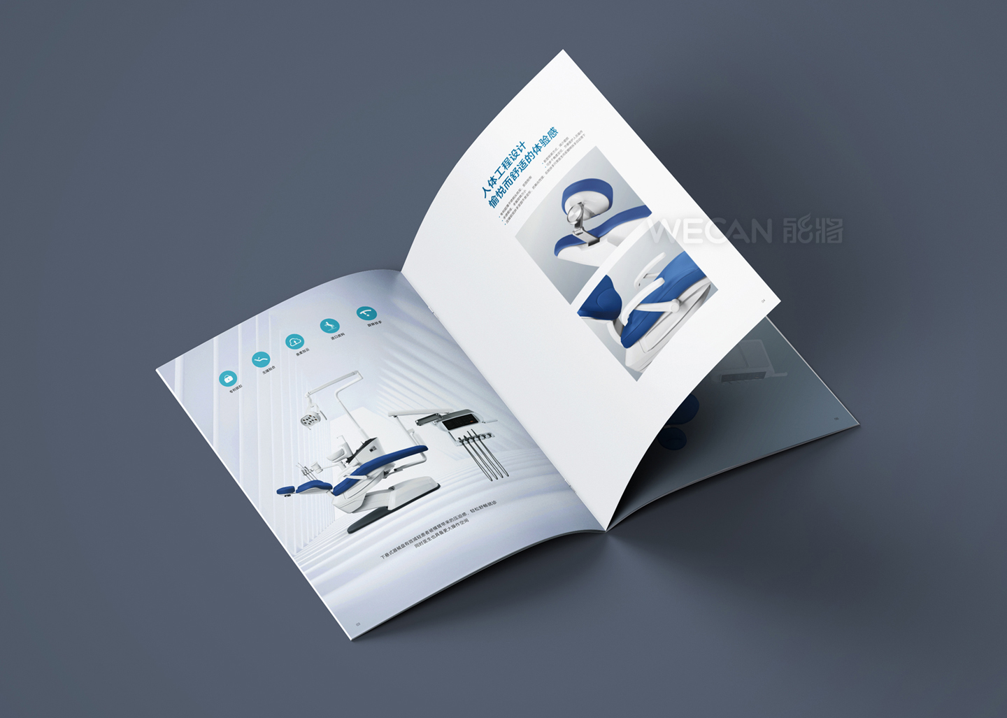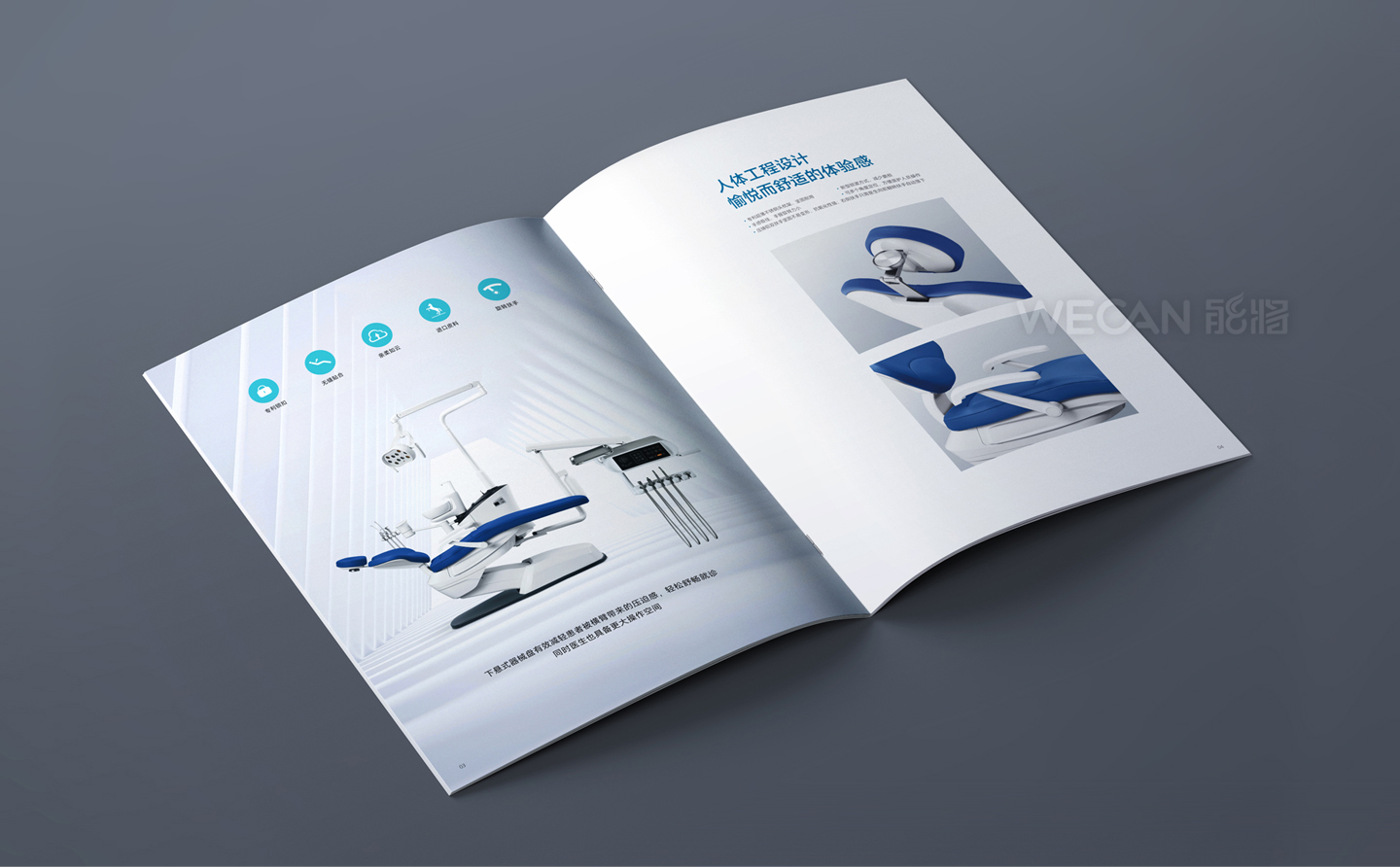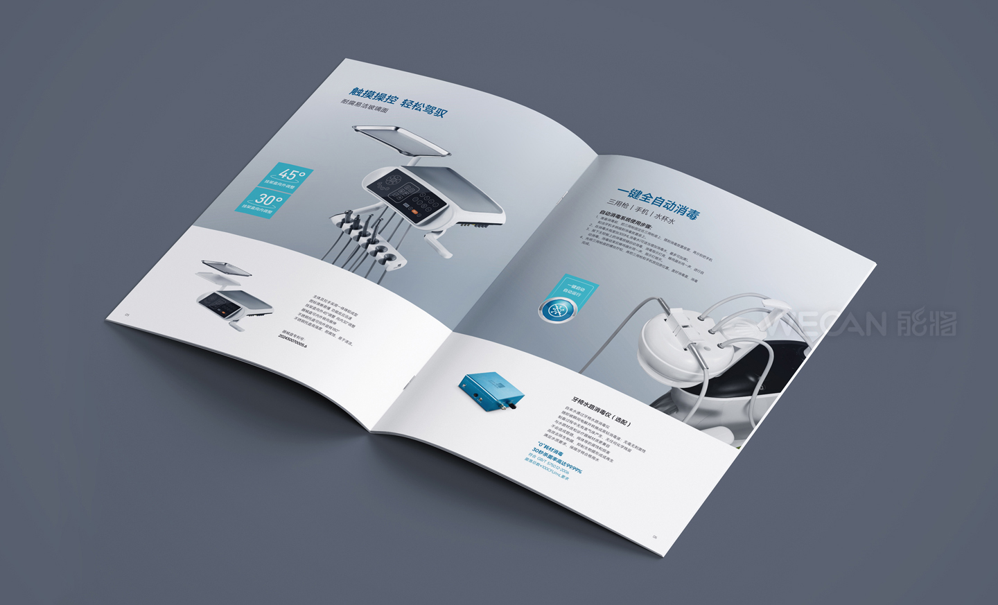 中创医疗器械拥有丰富而出色的产品群体,本次所展示的产品画册是中创交由我们负责设计的其中一个系列产品。作为行业领先的牙科器械品牌,中创的产品定位非常国际化,因此产品画册的设计同样也是走国际、时尚、简约的方向,同时我们更融入了生活元素和运用了湖水蓝的色调,能充分体现了一种清新和健康的感觉。