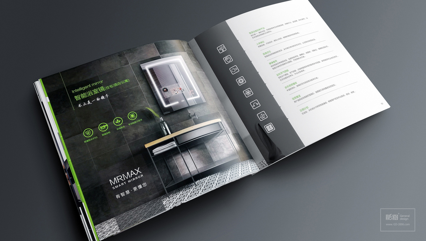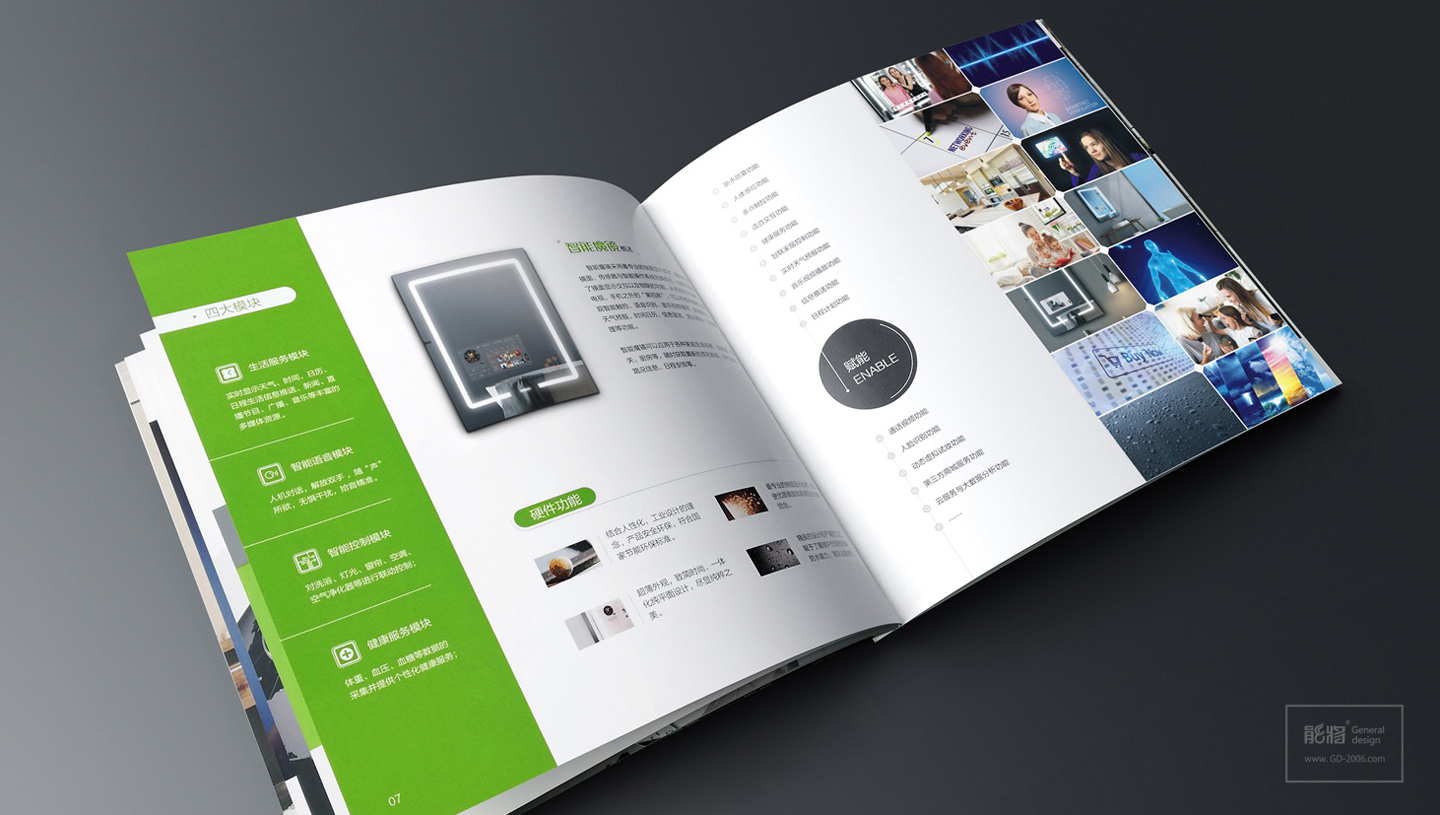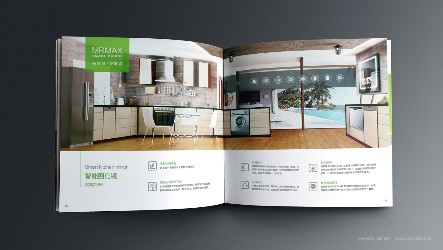 微联智能魔镜是一款新概念的高科技的智能物联家电产品,针对智能科技、与生活家居互联的产品特性,微联产品画册设计体现了智能前卫而不失生活风格,首先画册的主色调跟进了微联科技的品牌标准色-鲜绿色,让品牌形象在画册设计中得到了延续性;另外画册特意采用正方形的宽大尺寸,让画册内页跨页的产品应用场景图一览无遗,突显画册设计以展示产品作为核心诉求,结合智能和生活的设计元素和内页设计排版的简约化,更让画册极具智能、时尚生活和科技感。