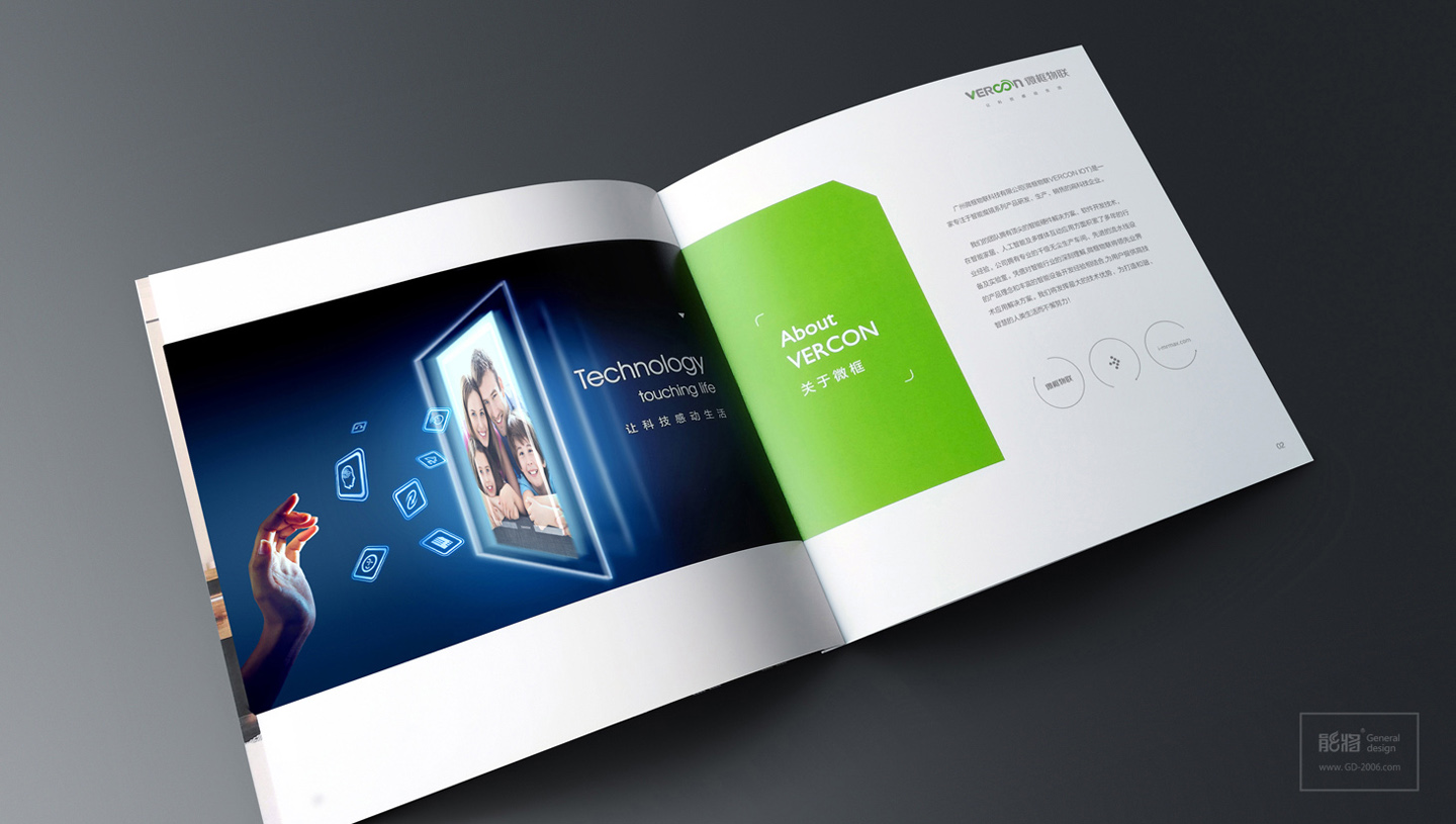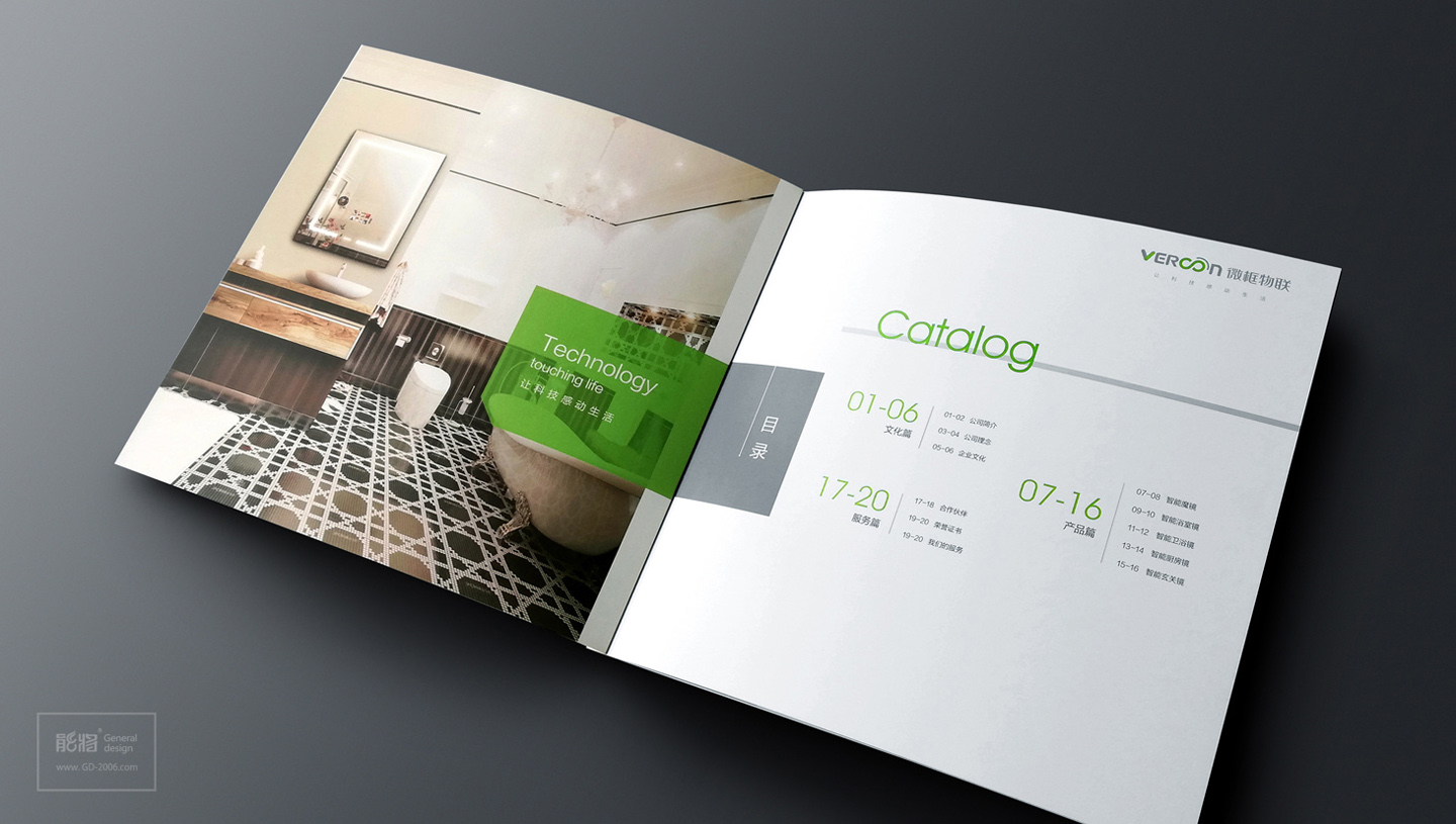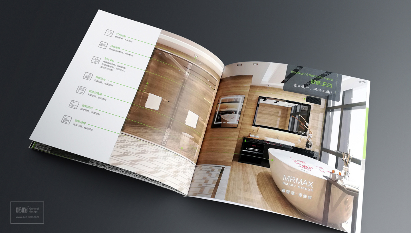 微联智能魔镜是一款新概念的高科技的智能物联家电产品,针对智能科技、与生活家居互联的产品特性,微联产品画册设计体现了智能前卫而不失生活风格,首先画册的主色调跟进了微联科技的品牌标准色-鲜绿色,让品牌形象在画册设计中得到了延续性;另外画册特意采用正方形的宽大尺寸,让画册内页跨页的产品应用场景图一览无遗,突显画册设计以展示产品作为核心诉求,结合智能和生活的设计元素和内页设计排版的简约化,更让画册极具智能、时尚生活和科技感。