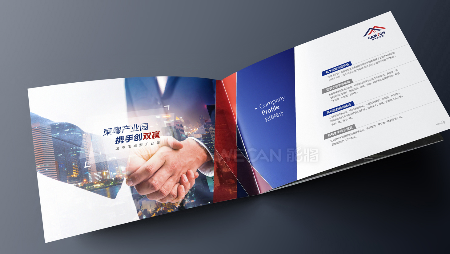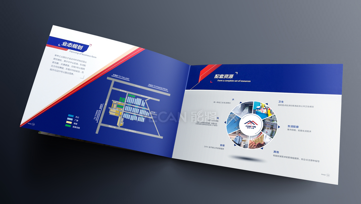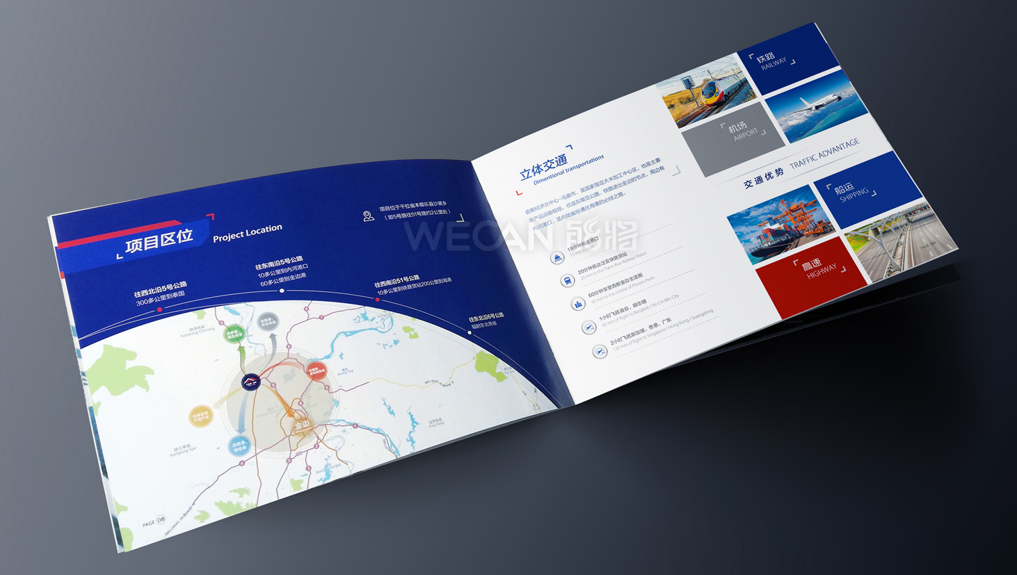 柬粤产业园招商册设计以吸引眼球和精准传递项目信息作为目的前提,从招商册的资料整合、精华亮点提炼、版块布局、地理分析等全方位的把控,成功让工业地产与商务风格的结合,通过招商册的“包装”,为柬粤产业园塑造一个跨国产业园的示范形象。招商册运用了较为跨跃性的版面设计,结合冲击性较强的色彩搭配,吸引众多客商的关注。另外考虑招商册跨国性的使用需求,招商册采用了便携式的横向小尺寸,与此同时横向尺寸更有利于各个招商推介场合PPT的使用。