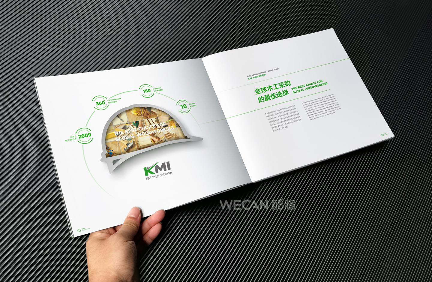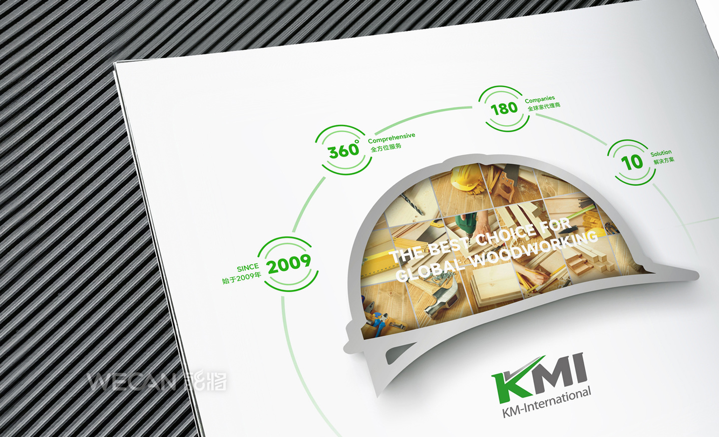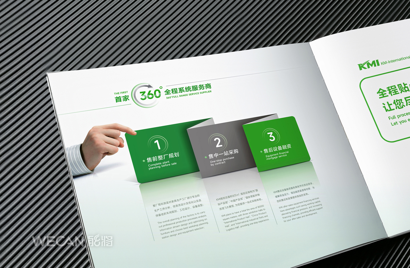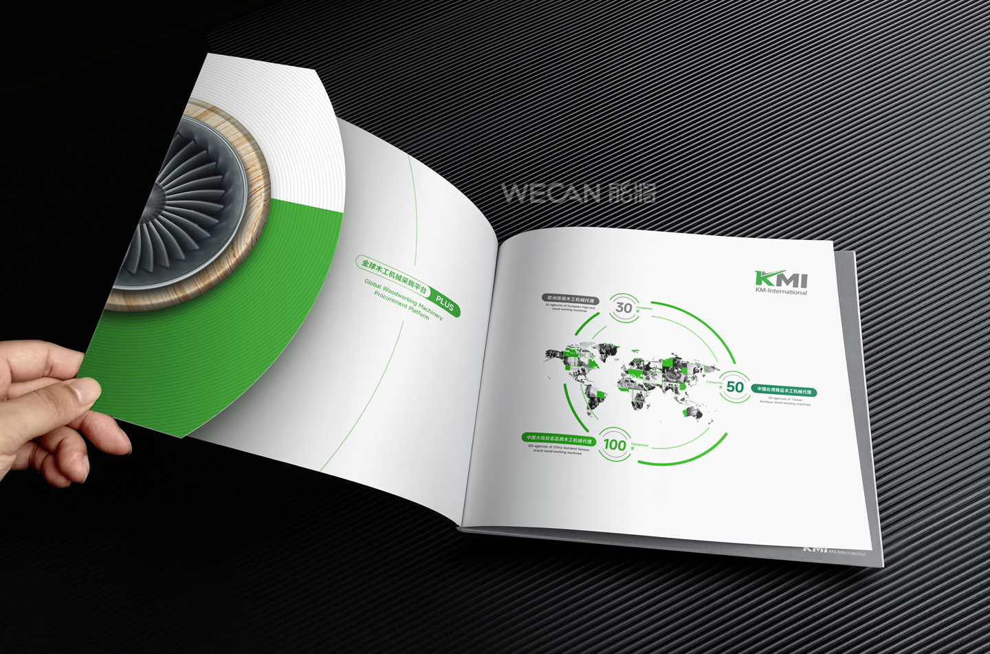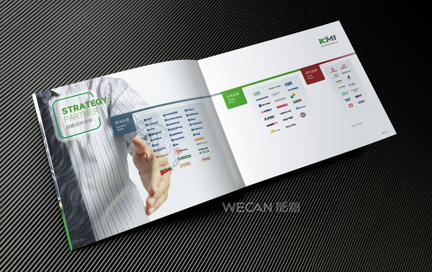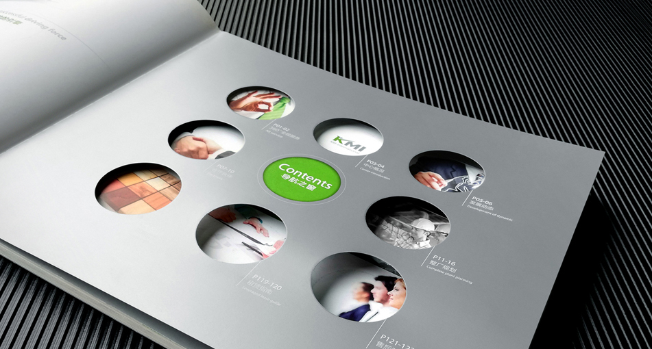 招商手册的设计要求有别于常规画册,非常讲究画册设计的视觉冲击力和夺目性,因此考验了设计师对画册设计效果精准的把控能力。KMI招商手册的封面采用了拉长设计和对半折叠的翻合方式,更以一个木框引擎作为灵魂元素,表达了KMI的木工机械行业特性,寓意KMI是一股能助推客户成功的强大的力量;而内页的设计更充分运用了品牌色彩的配搭,对多个内容要点进行了量身订制的创意画面设计,以提高客户对招商内容的吸引力。总体而言,整本招商册设计体现了商务感、创新感、科技感和国际化的创作风格,结合独特的印刷工艺更显一种别出心裁的精致感。