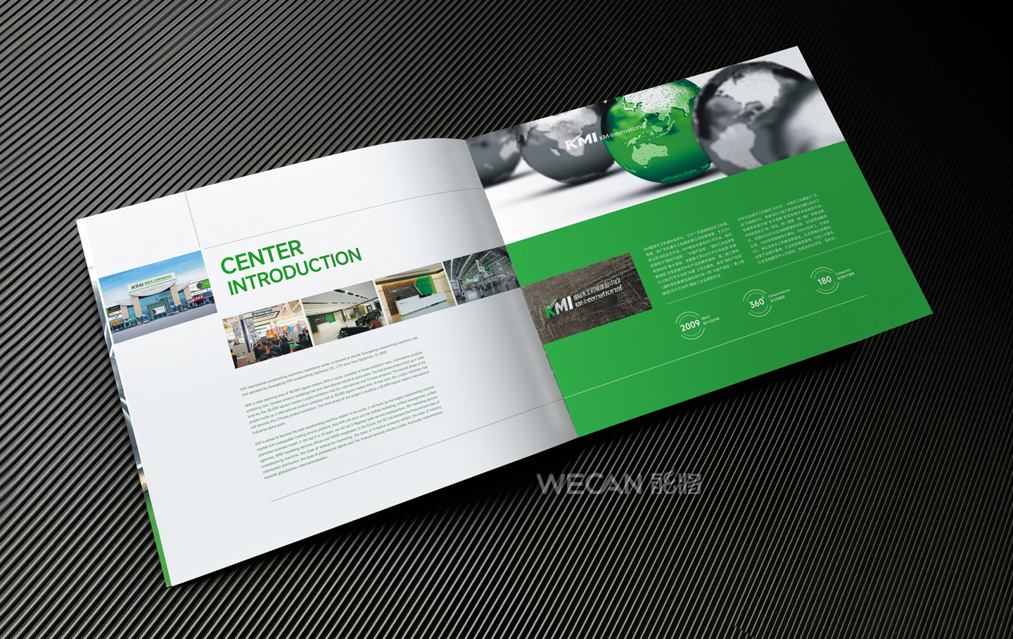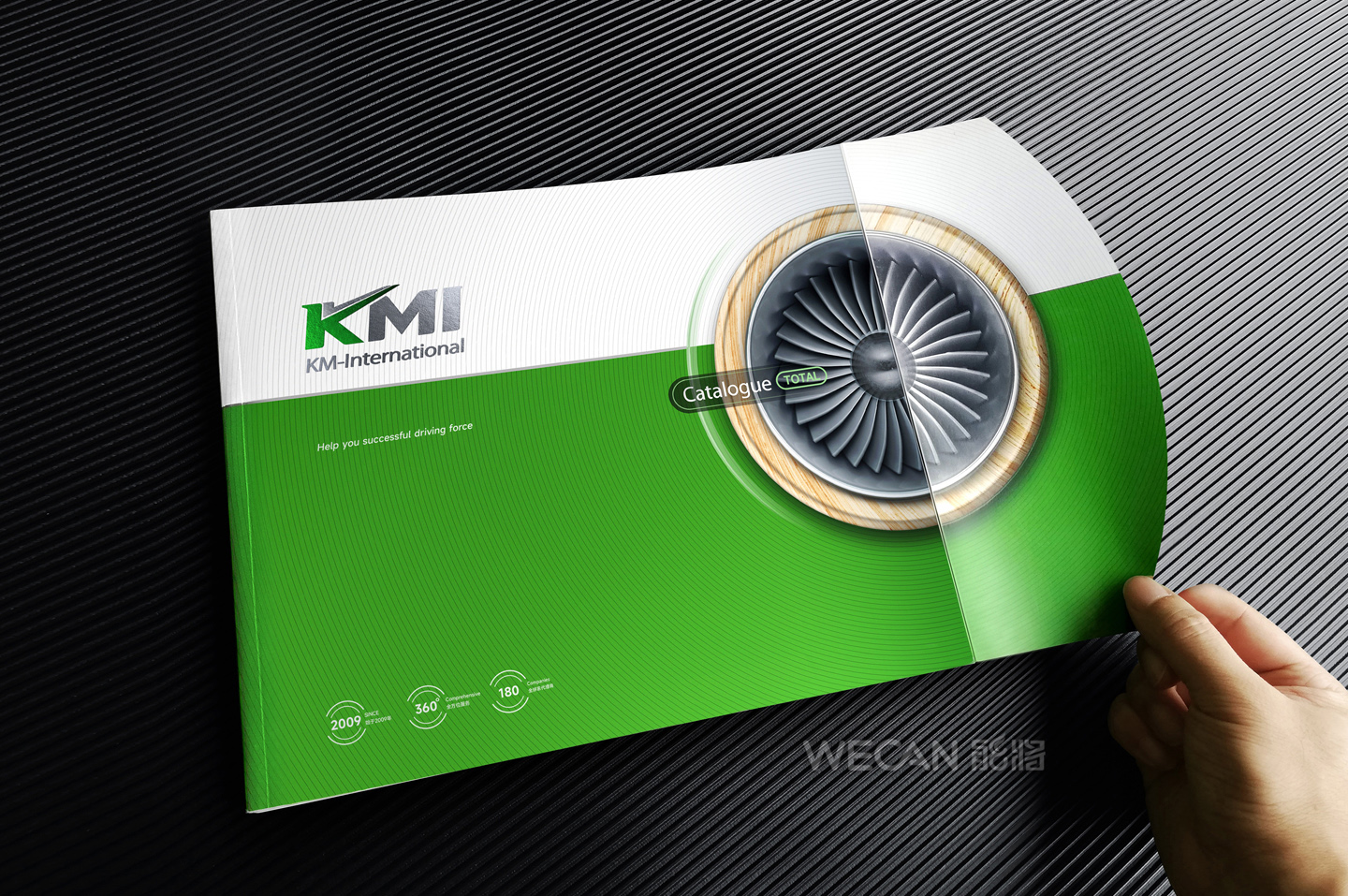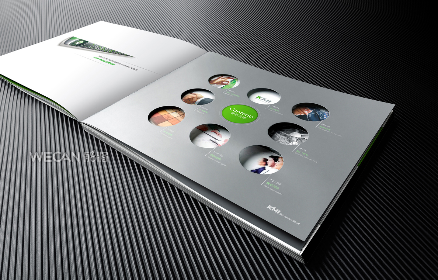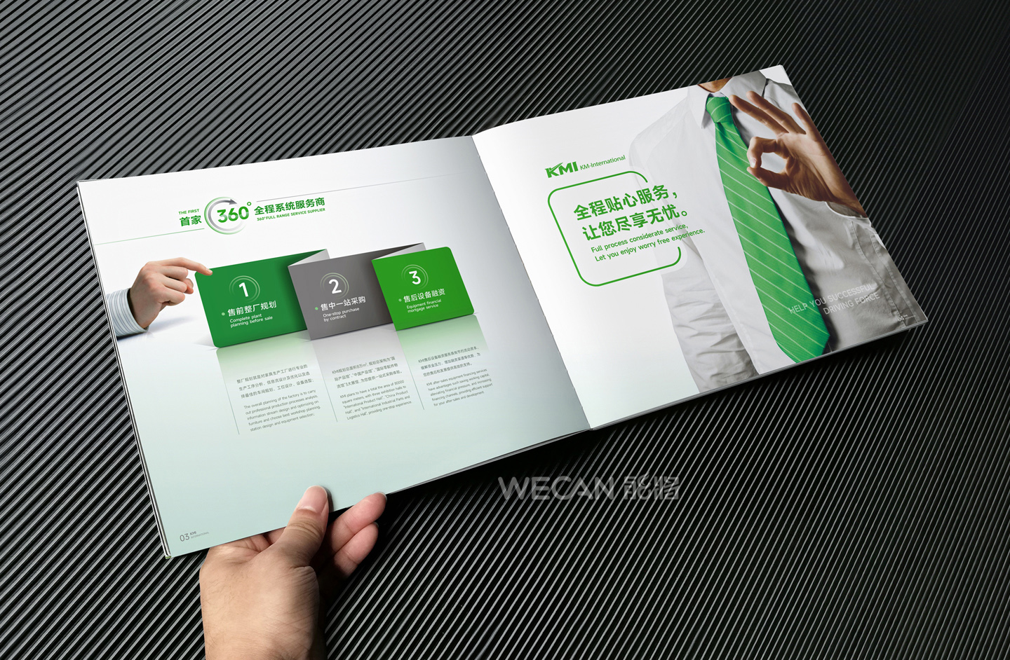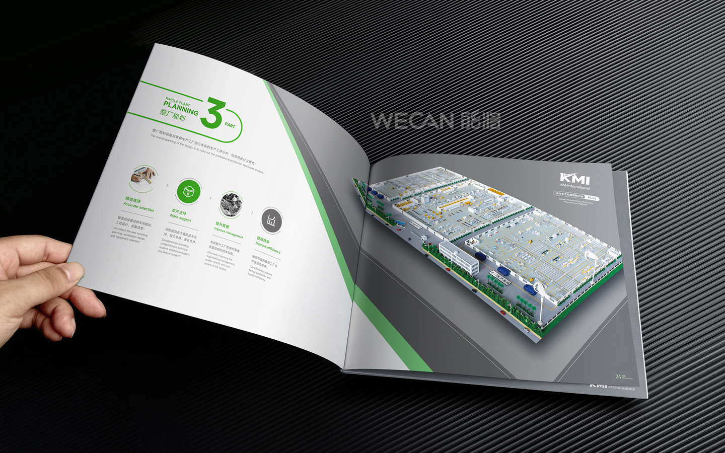 招商手册的设计要求有别于常规画册,非常讲究画册设计的视觉冲击力和夺目性,因此考验了设计师对画册设计效果精准的把控能力。KMI招商手册的封面采用了拉长设计和对半折叠的翻合方式,更以一个木框引擎作为灵魂元素,表达了KMI的木工机械行业特性,寓意KMI是一股能助推客户成功的强大的力量;而内页的设计更充分运用了品牌色彩的配搭,对多个内容要点进行了量身订制的创意画面设计,以提高客户对招商内容的吸引力。总体而言,整本招商册设计体现了商务感、创新感、科技感和国际化的创作风格,结合独特的印刷工艺更显一种别出心裁的精致感。