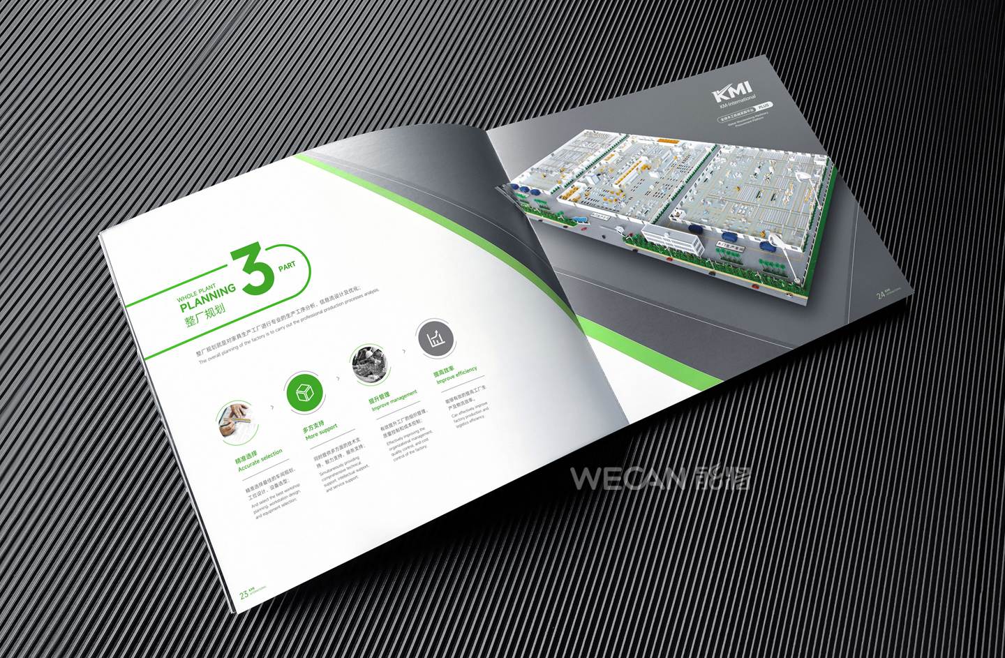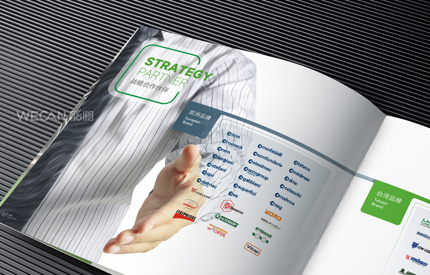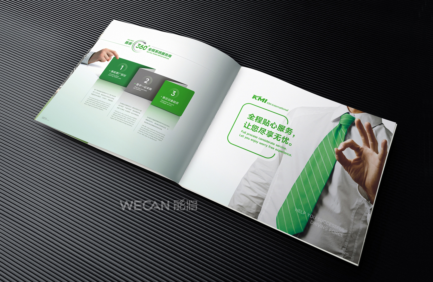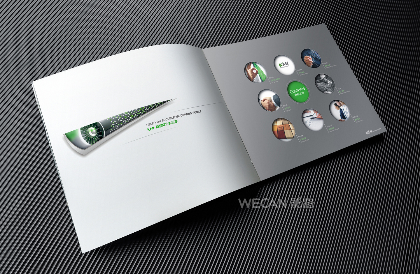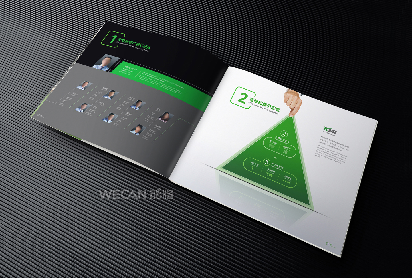 招商手册的设计要求有别于常规画册,非常讲究画册设计的视觉冲击力和夺目性,因此考验了设计师对画册设计效果精准的把控能力。KMI招商手册的封面采用了拉长设计和对半折叠的翻合方式,更以一个木框引擎作为灵魂元素,表达了KMI的木工机械行业特性,寓意KMI是一股能助推客户成功的强大的力量;而内页的设计更充分运用了品牌色彩的配搭,对多个内容要点进行了量身订制的创意画面设计,以提高客户对招商内容的吸引力。总体而言,整本招商册设计体现了商务感、创新感、科技感和国际化的创作风格,结合独特的印刷工艺更显一种别出心裁的精致感。