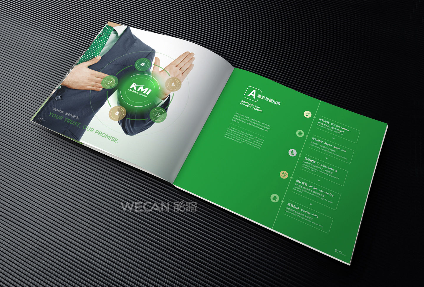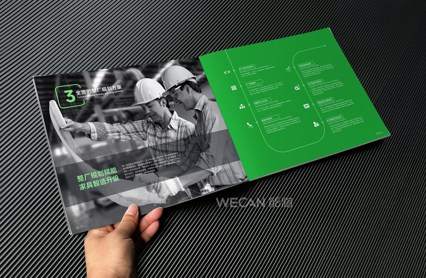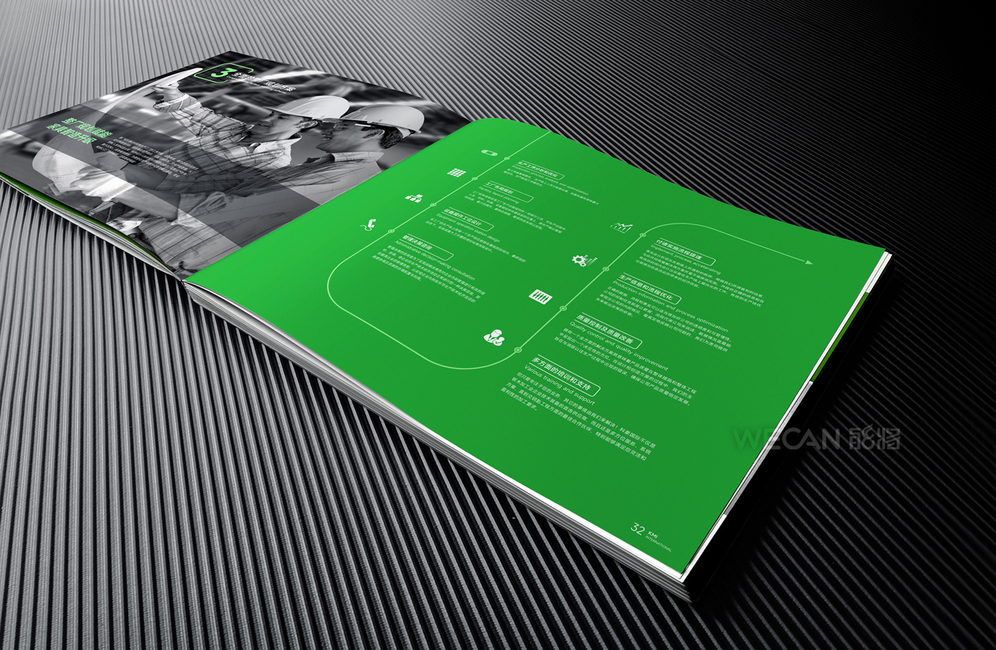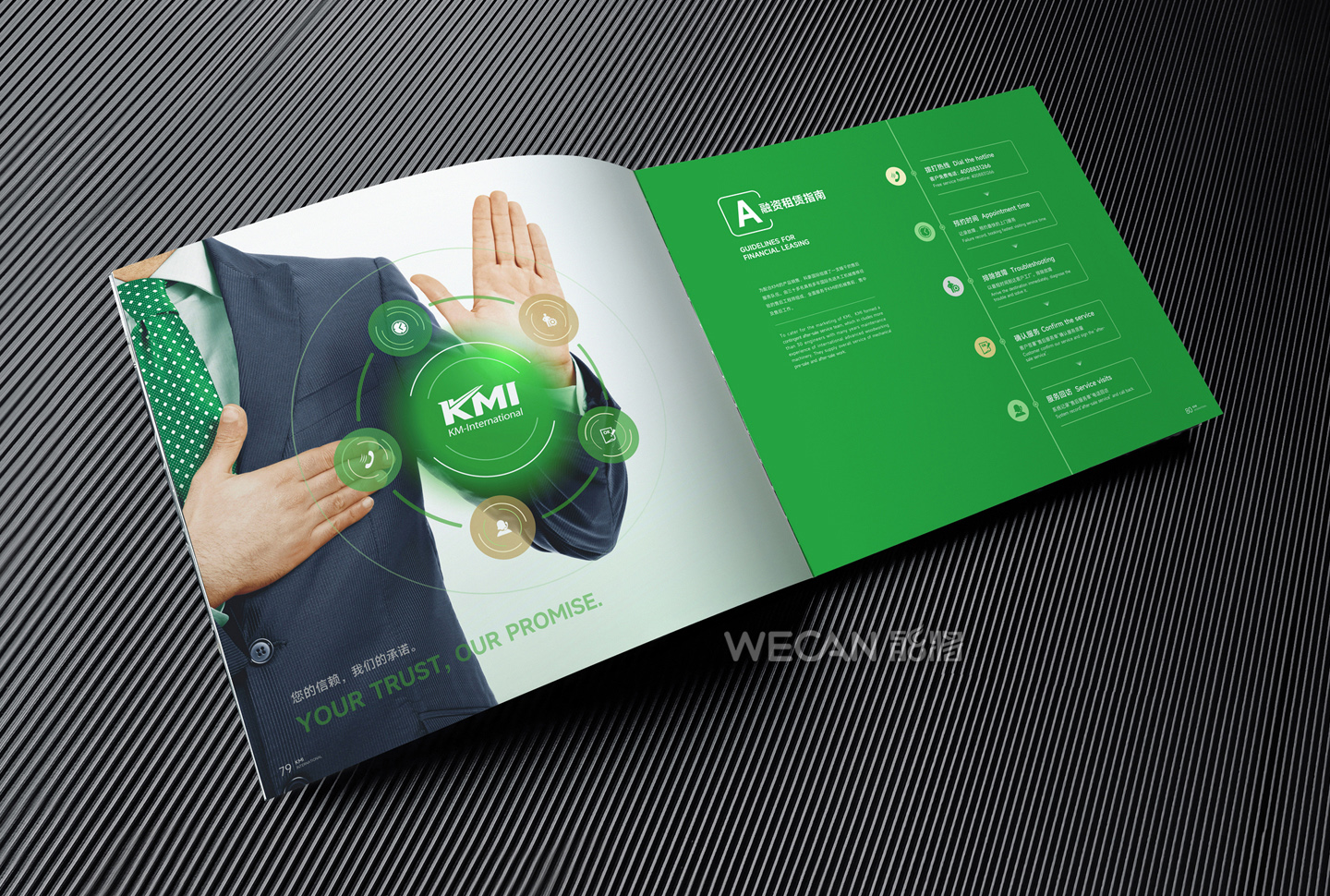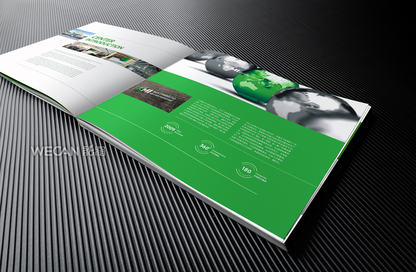 招商手册的设计要求有别于常规画册,非常讲究画册设计的视觉冲击力和夺目性,因此考验了设计师对画册设计效果精准的把控能力。KMI招商手册的封面采用了拉长设计和对半折叠的翻合方式,更以一个木框引擎作为灵魂元素,表达了KMI的木工机械行业特性,寓意KMI是一股能助推客户成功的强大的力量;而内页的设计更充分运用了品牌色彩的配搭,对多个内容要点进行了量身订制的创意画面设计,以提高客户对招商内容的吸引力。总体而言,整本招商册设计体现了商务感、创新感、科技感和国际化的创作风格,结合独特的印刷工艺更显一种别出心裁的精致感。