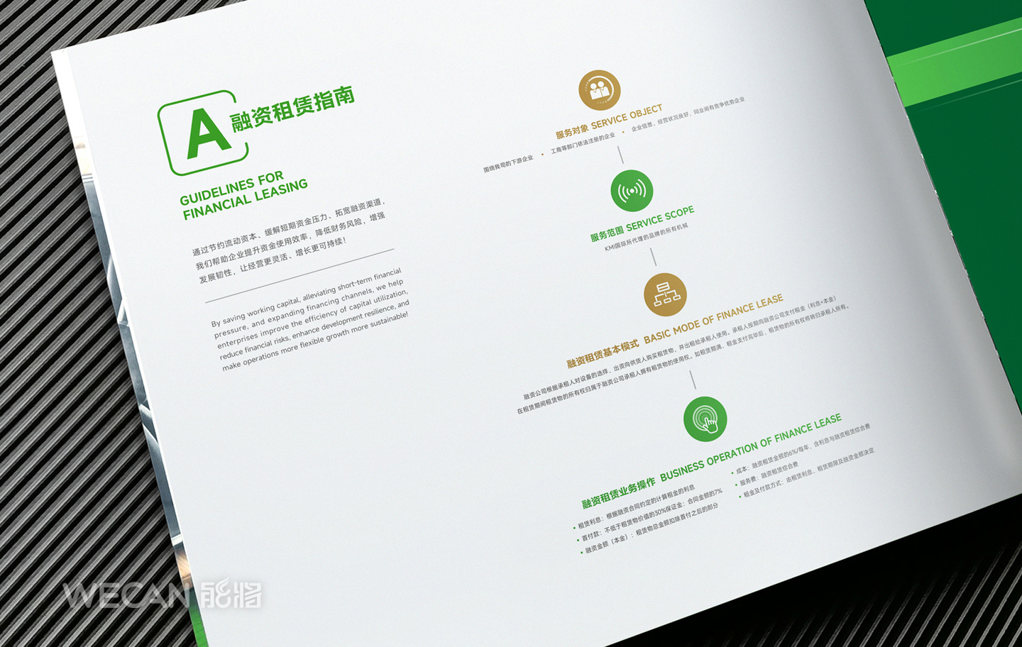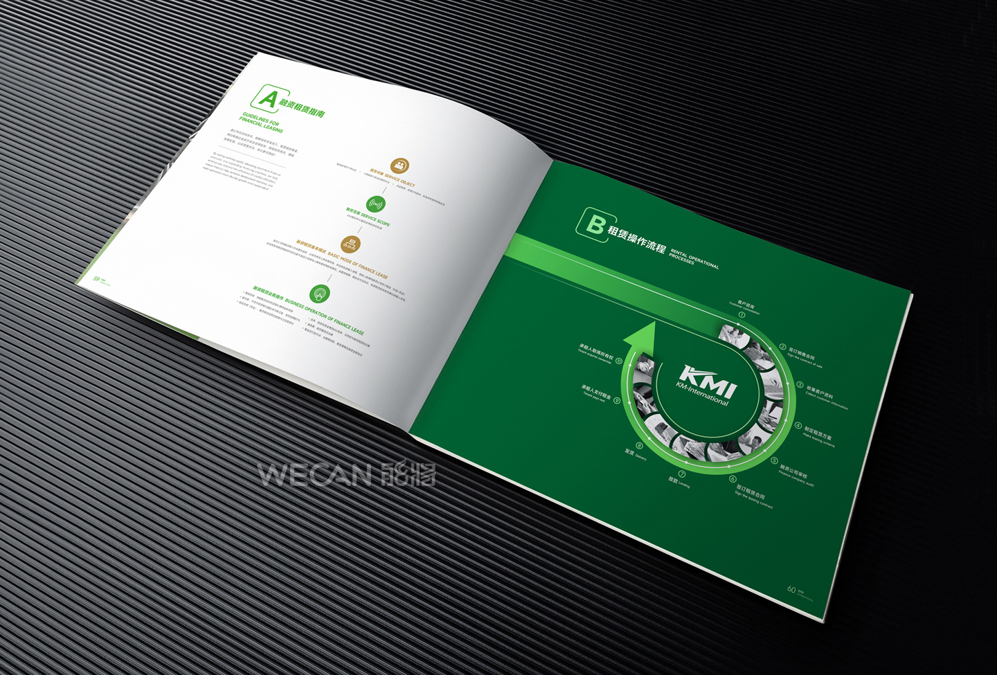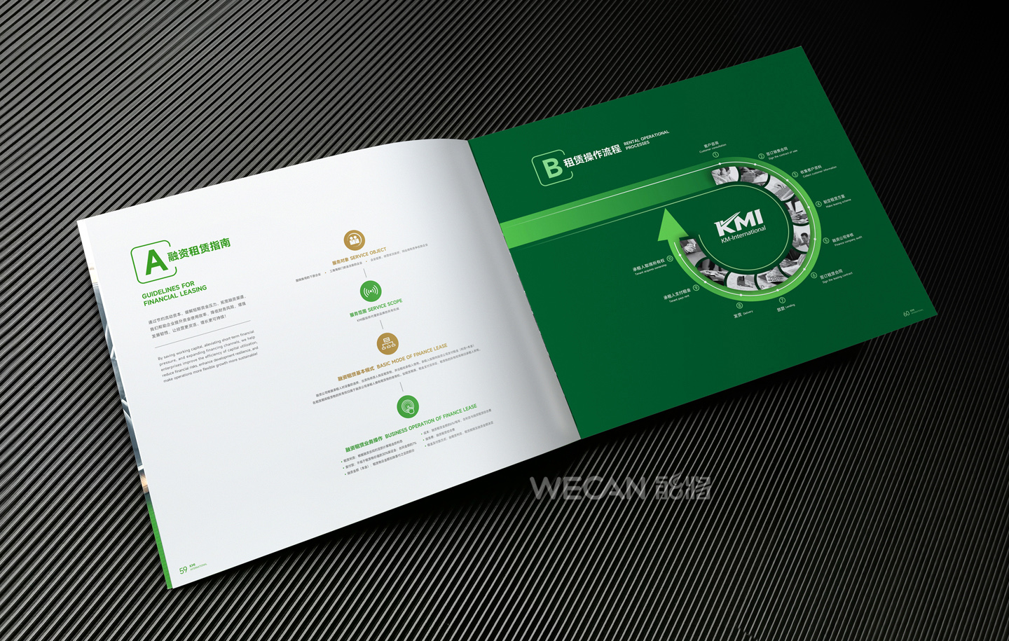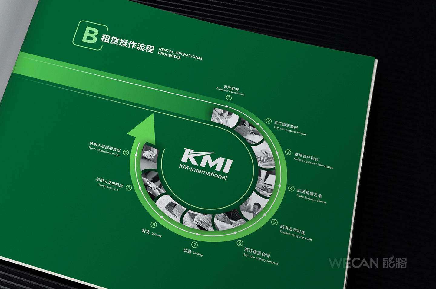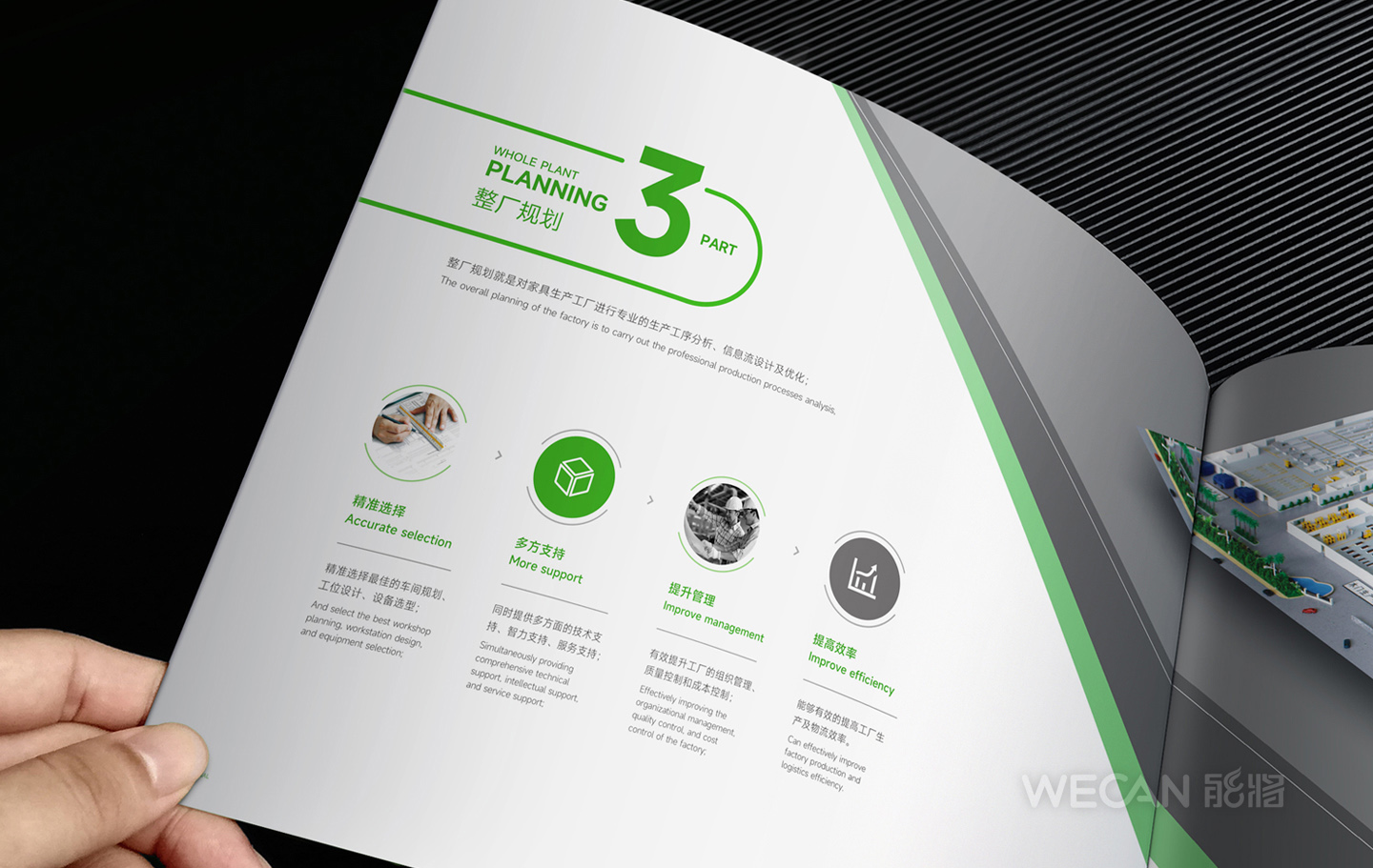 招商手册的设计要求有别于常规画册,非常讲究画册设计的视觉冲击力和夺目性,因此考验了设计师对画册设计效果精准的把控能力。KMI招商手册的封面采用了拉长设计和对半折叠的翻合方式,更以一个木框引擎作为灵魂元素,表达了KMI的木工机械行业特性,寓意KMI是一股能助推客户成功的强大的力量;而内页的设计更充分运用了品牌色彩的配搭,对多个内容要点进行了量身订制的创意画面设计,以提高客户对招商内容的吸引力。总体而言,整本招商册设计体现了商务感、创新感、科技感和国际化的创作风格,结合独特的印刷工艺更显一种别出心裁的精致感。